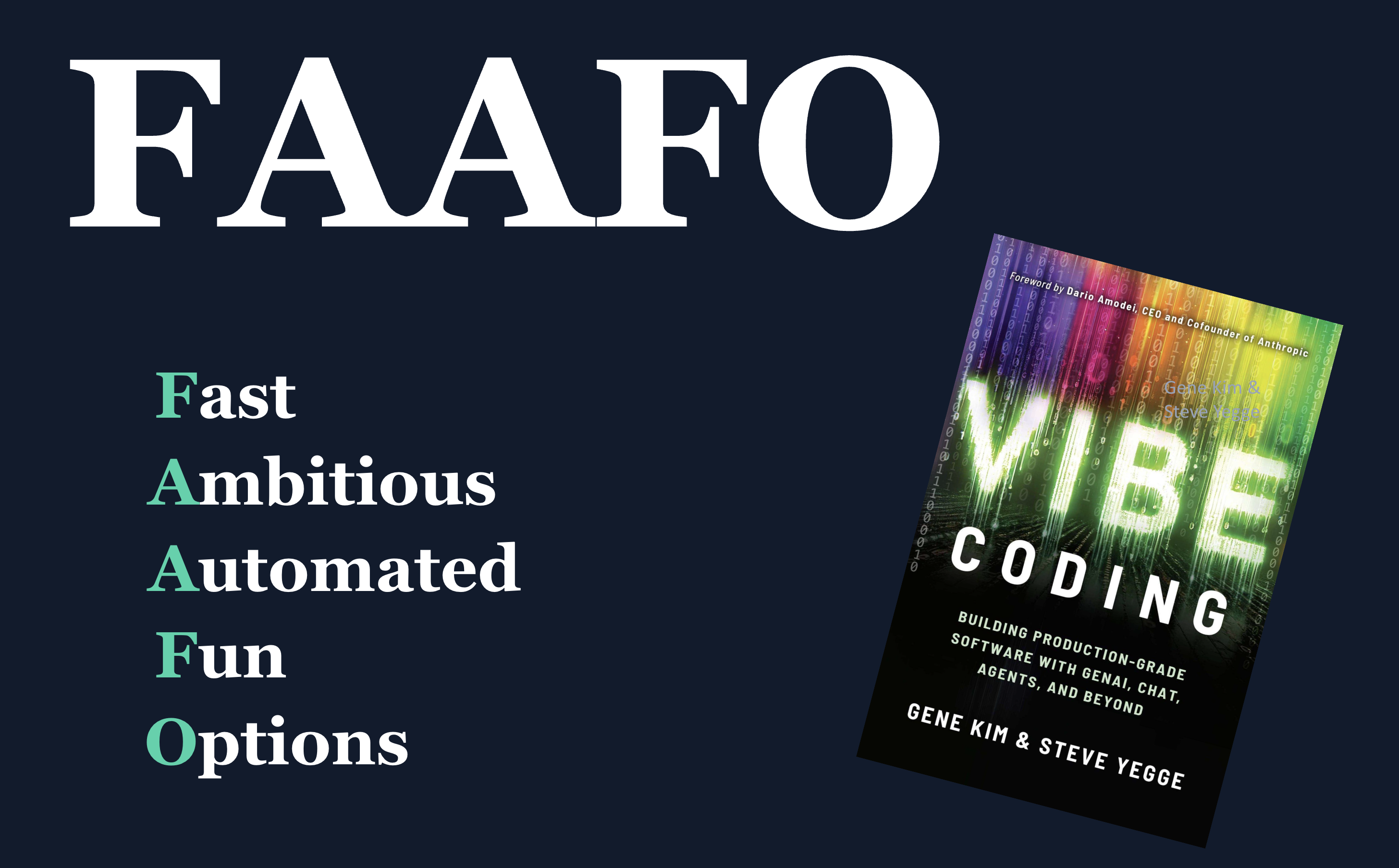 I’ve enjoyed reading Gene Kim and Steve Yegge book Vibe Coding, and their FAAFO acronym stuck with me. There’s a useful tension in there between speed and consequence. It’s a good lens for this phase.